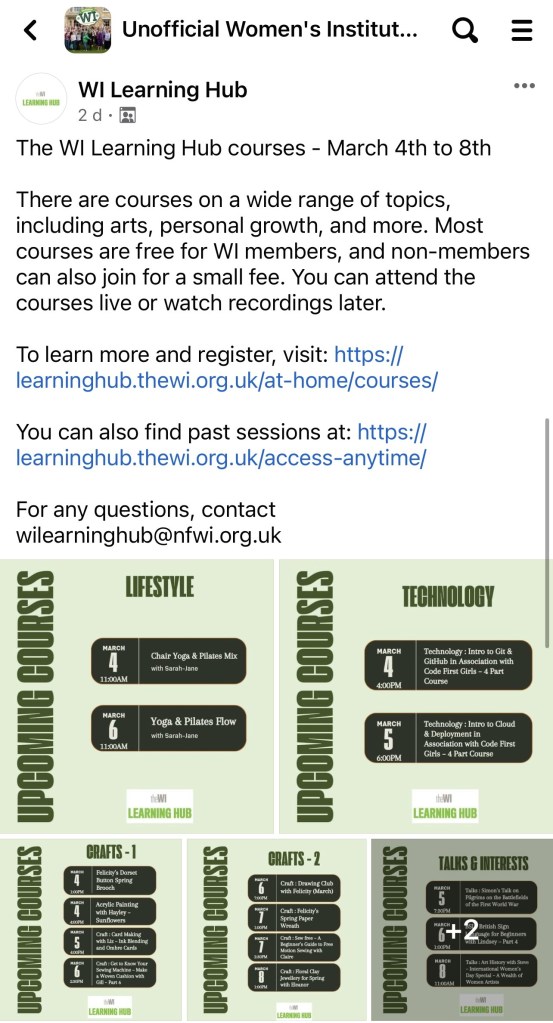 There are lots of courses that you may be interested in, many of which are free of charge, via the WI learning Hub. the link to access is as follows :- https://learninghub.thewi.org.uk/at-home/courses/