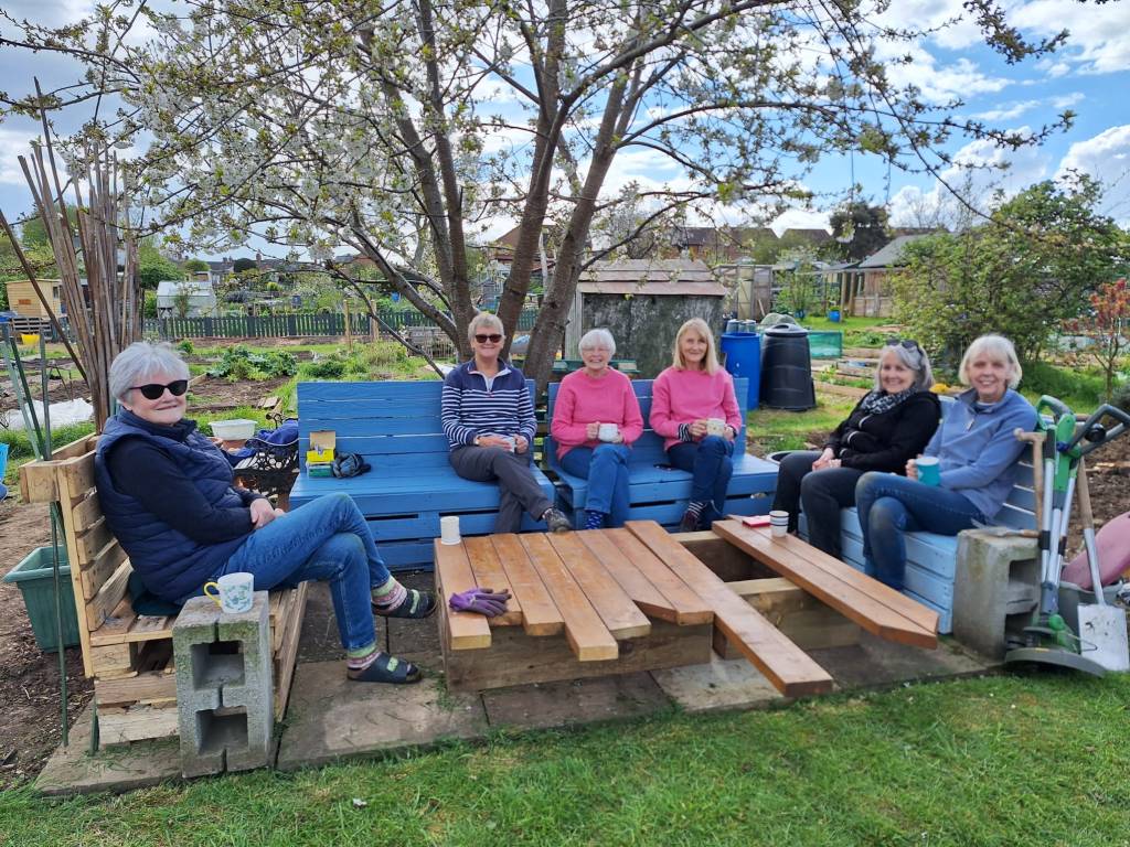 The Gardening Girls have started this years big project – moving the terrace and creating additional seating to accommodate our growing group. Nearly finished – we did some test sitting on the new pallet furniture last week – the table is still work in progress…