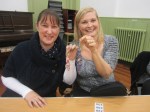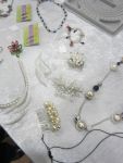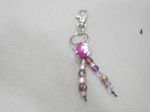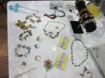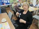 She then demonstrated the art of simple beadmaking (or so we thought). She showed us how to take a long piece of thick thread, fold it into four and then knot it to form your own tailor made necklace or to tie it to a keyring. Then came the real challenge! Having chosen our selected beads, which came in a huge variety of colours, sizes and textures, we had to thread the signature bead – not too difficult, as these tended to come with large holes. So far, so good. However, then we faced some real challenges for the evening, namely the ability to see small holes, licking the end of your thread to get a point and trying to get it through the holes in the beads. Not so easy, as the hole sizes varied greatly, so, very quickly, carefully chosen, colour coded patterns were abandoned! However, lots of good humour plus the encouragement of fellow WI members, and most people successfully produced their first piece of beadwork. They proudly display their handiwork below.