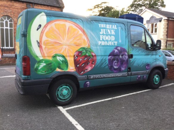 With those thought provoking figures in mind, Bobby and Alison talked passionately about their rationale for setting up their project, how they obtain food donations regularly from a local, well known supermarket, wholesale fruit and veg market and international food shops.  The menu in their ‘pay as you feel’ cafe depends entirely on donated ingredients and recipes are agreed during daily banter in the kitchen.  Dried fish from Africa proved an unusual challenge but results in a very tasty fish stew.  Alison described some of the social outcomes of the project, including meeting with others at the cafe when coming to eat, volunteering and offering skills, such as the painted van in the picture.  Nothing is wasted, even plastic plates and cutlery are washed and used again and vegetable peelings are  composted.